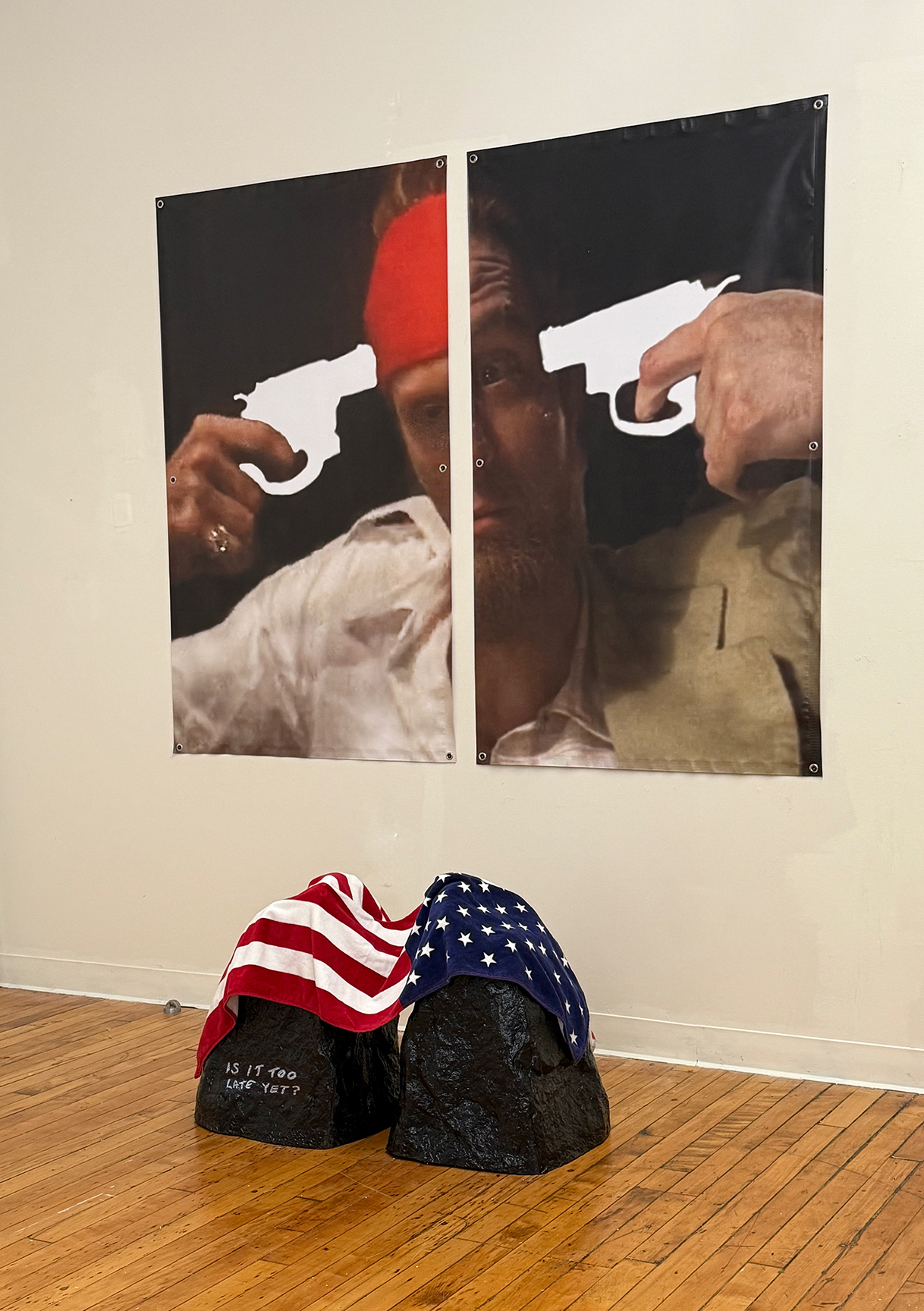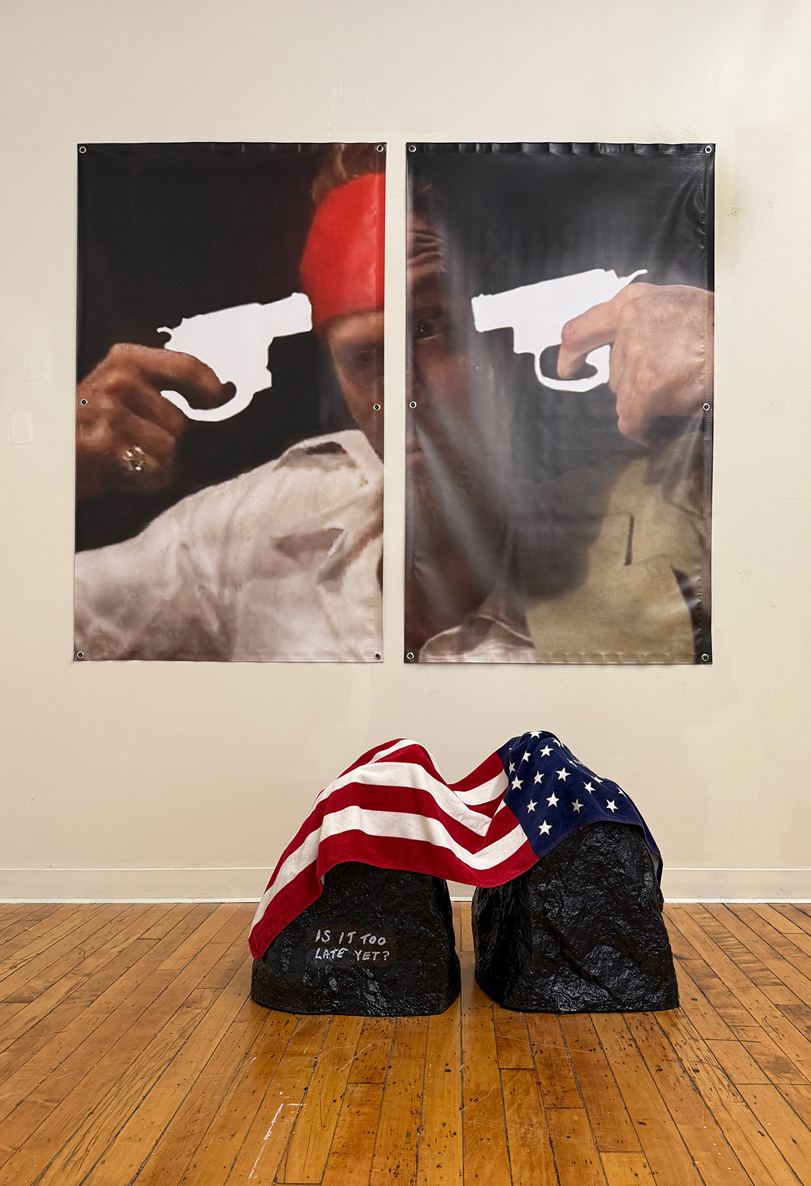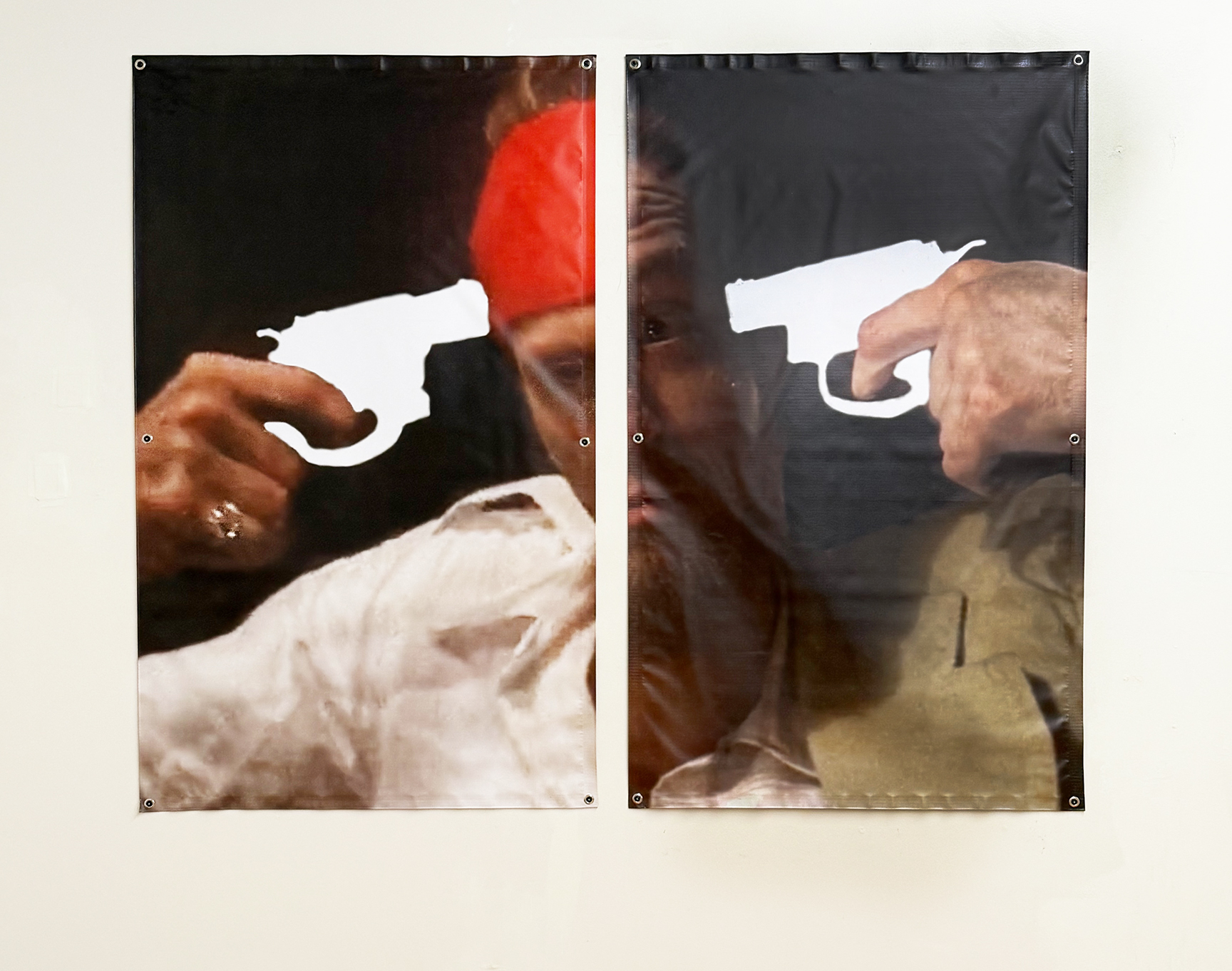 like father like son, (L), tell me to smile again, (R), paper targets and acrylic paint on corrugated cardboard, peeled.